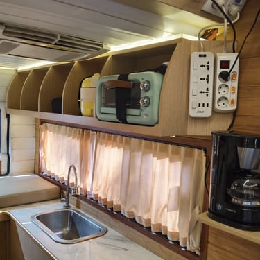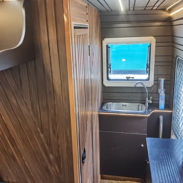 Inside, you’ll find a convertible sofa-bed, compact kitchen, induction hob, and sink — all designed for efficient living on the road.
