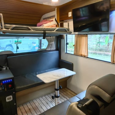 Equipped with a sofabed, Dometic rooftop tent, and essential camping amenities like a cooler box, smart TV, and portable toilet, Mr. D is all about making space work smarter — not harder.